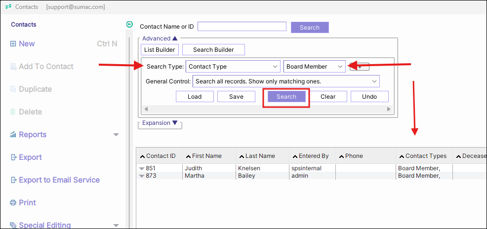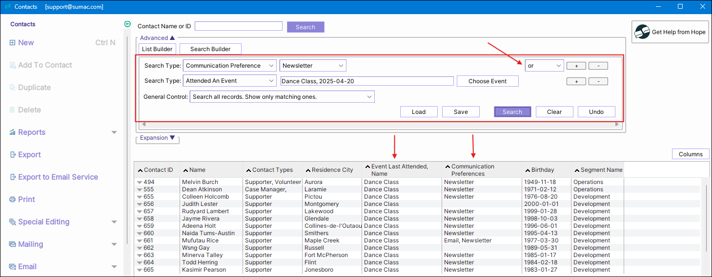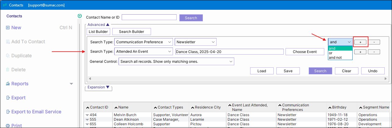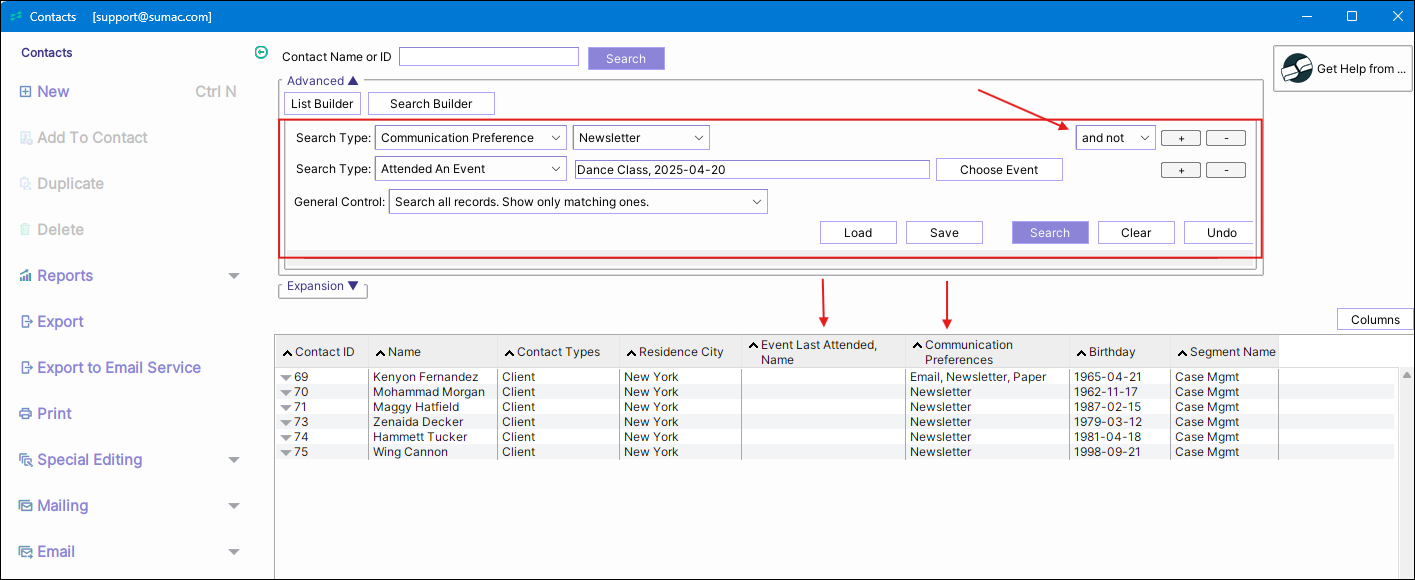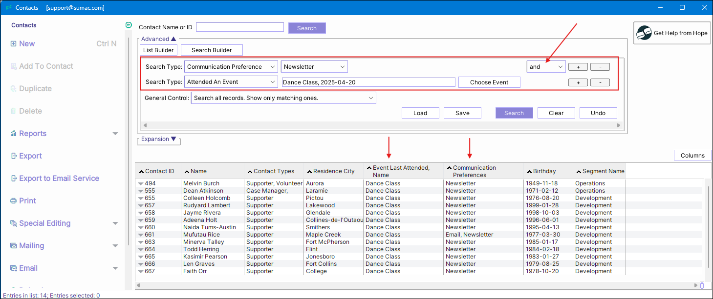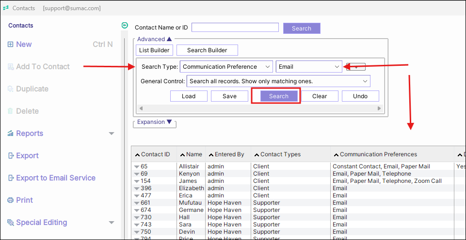 choose the Communication Preference: Newsletter. Click Search – and Sumac finds