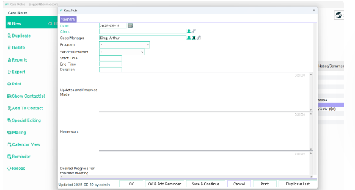 When creating a new Case Note, the Case Manager field will auto-fill with your user details if you are linked to the case as a manager. This reduces data entry steps and ensures accuracy in case records.