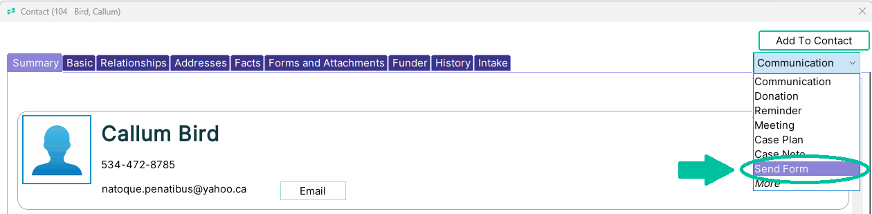 You can now select “Send Form” directly from the Add to Contact menu, instead of navigating to the Attachments tab.