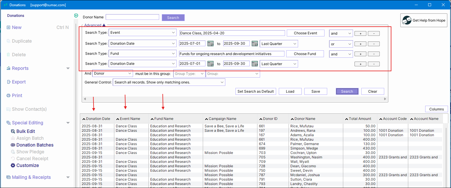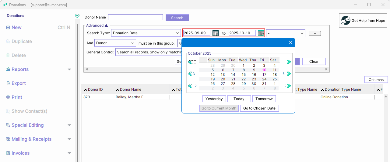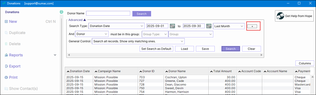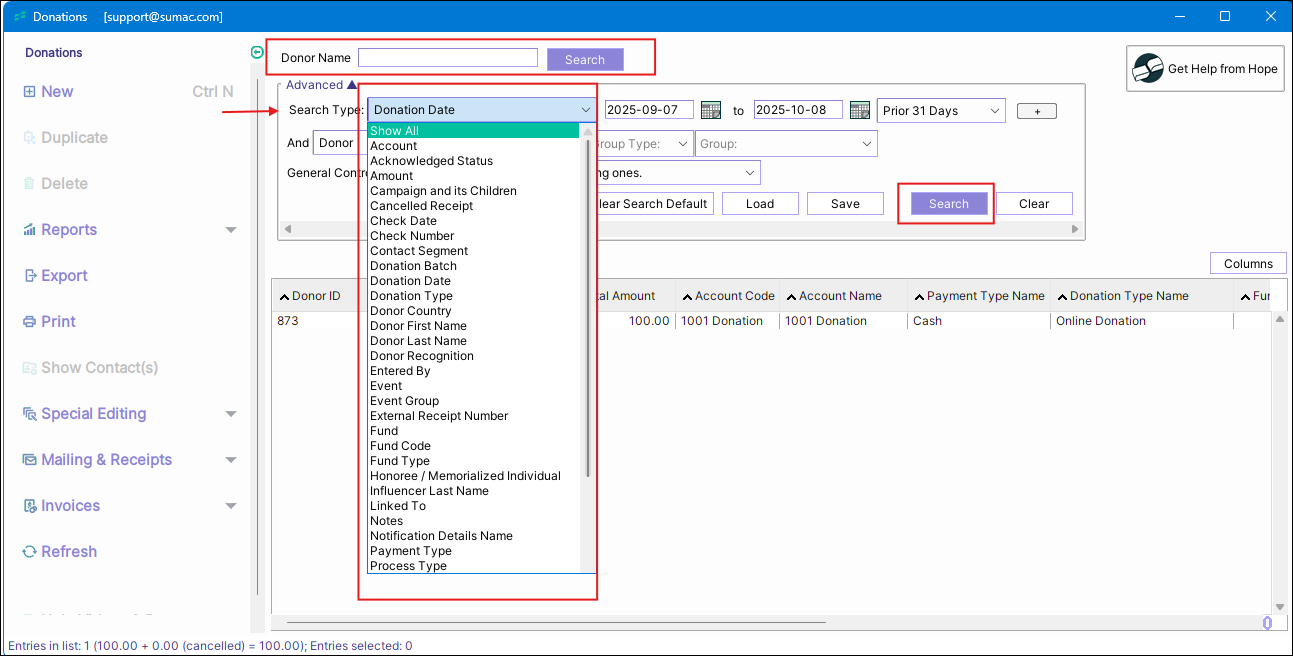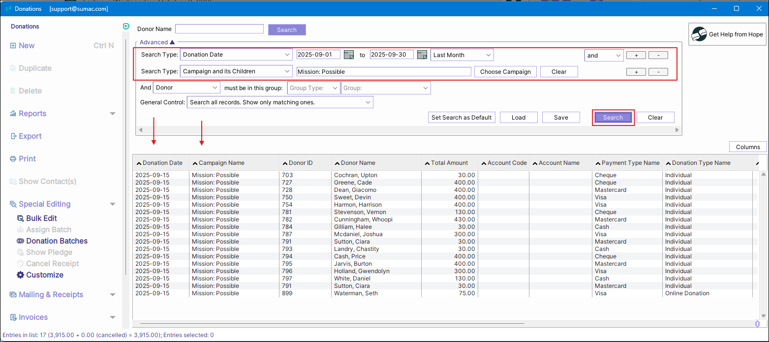 Click Search and Sumac finds all the donations that match the criteria specified.