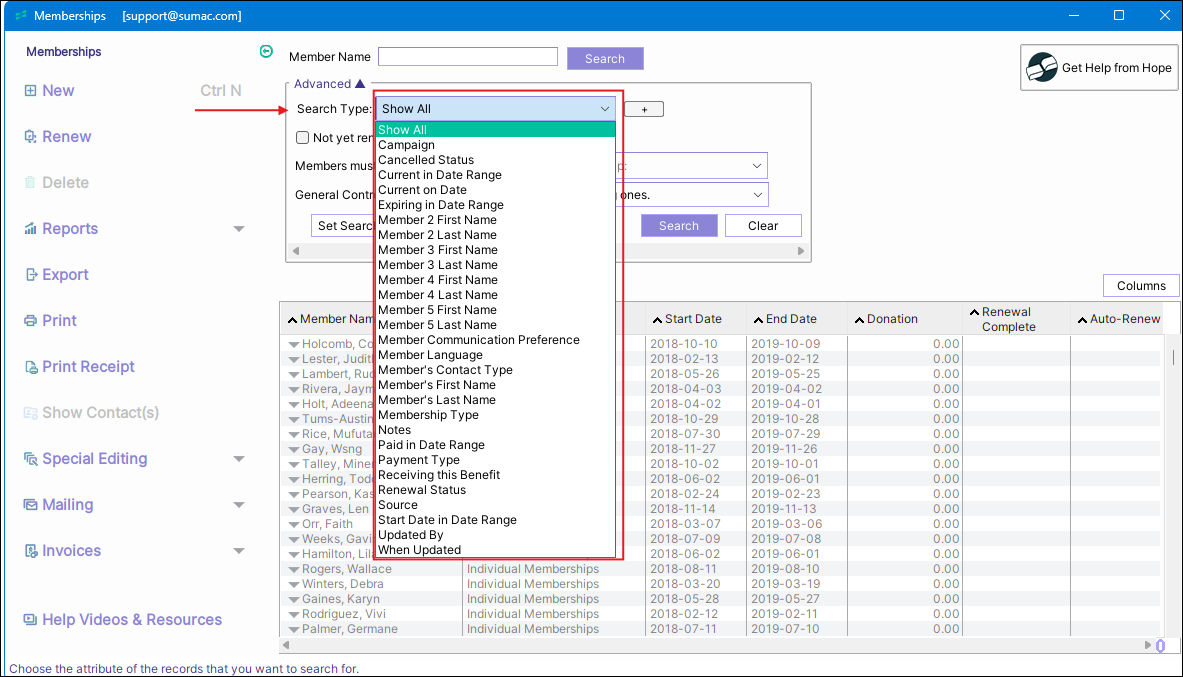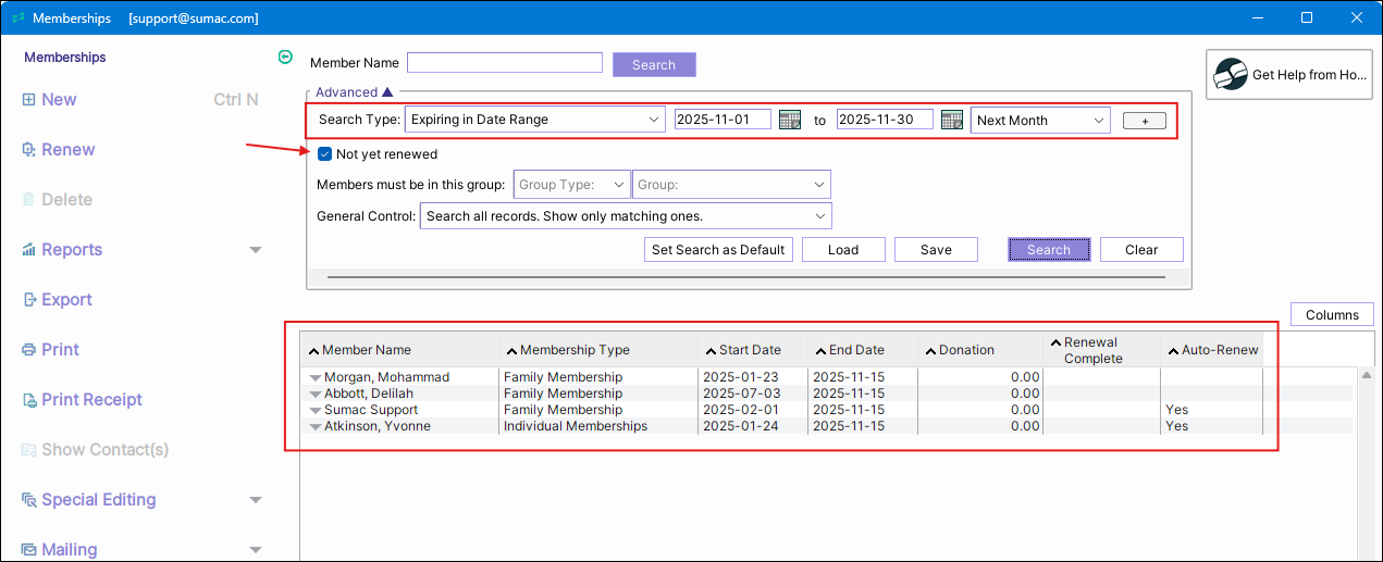 that meet the above criterion and have not yet been renewed. Click Search, and Sumac finds all the membership records that